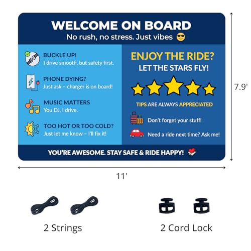 Click for More Images Start the Ride with a Smile - Greets riders with a clear welcome and friendly reminders for seatbelts phone charging music and temperature comfortGentle Nudge for Tips and Ratings - Features star icons and playful messages...